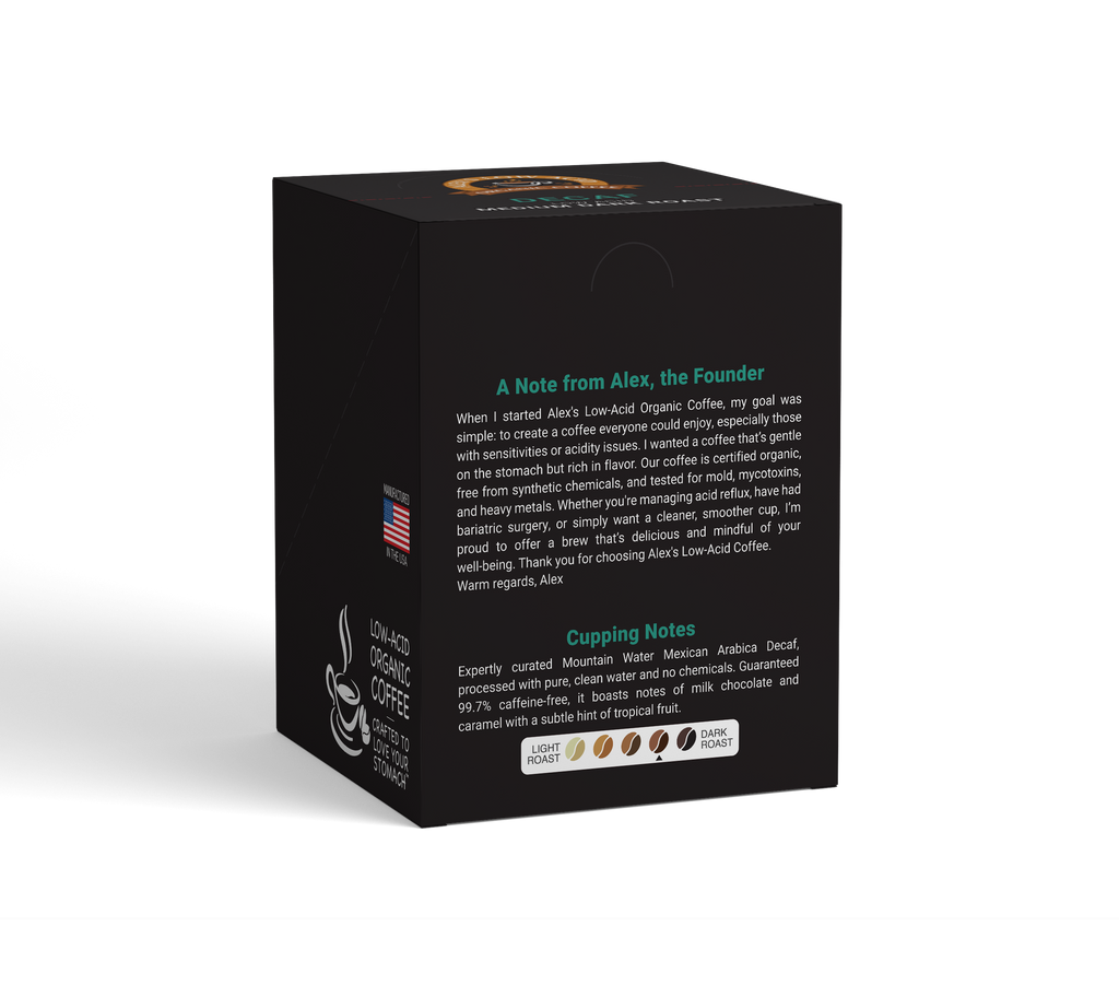 If you love coffee but it doesn’t always love you back, Alex’s Low Acid Organic Coffee™ Decaf Single Serve Packets make it easy to enjoy a smooth, flavorful  cup with half the caffeine and none of the discomfort. They are perfect for anyone who wants the taste and aroma of real coffee with less caffeine and low acidity. Satisfaction guaranteed.