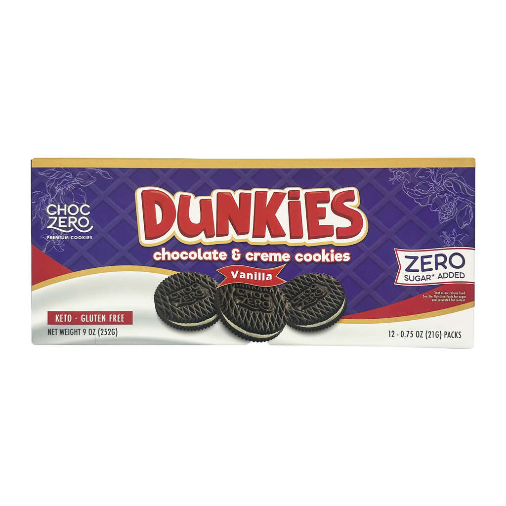 ChocZero Dunkies sandwich cream cookies are low in net carbs and completely gluten-free! Made with no sugar added, our low carb cookies are ready for you to enjoy without the sugar rush.
