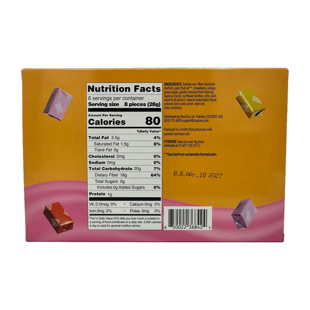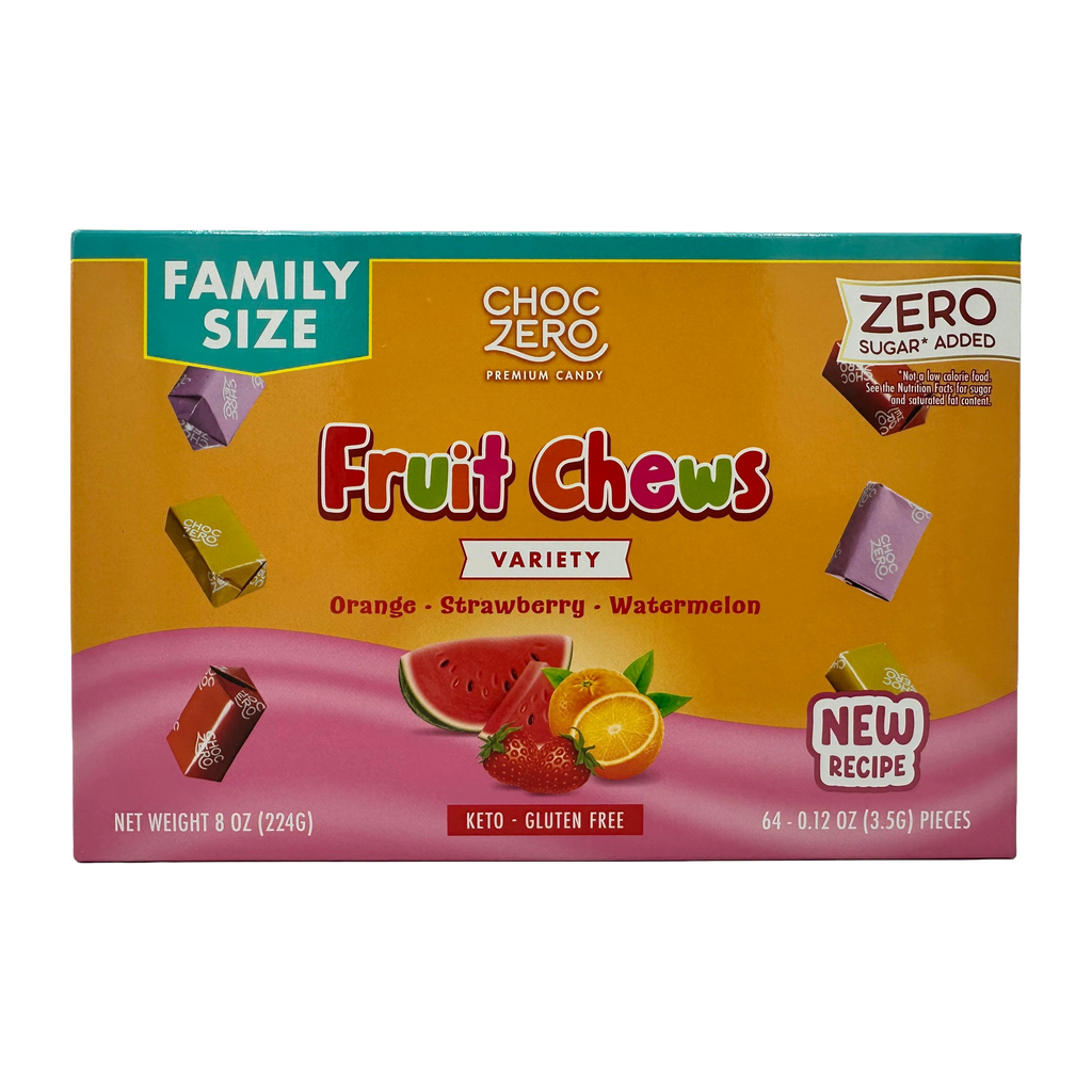 Bursting with the flavor of strawberry, watermelon, and orange, our sugar free fruit chews are just like their sugary components--without any of the junk! They're the perfect treat to take with you when you want the deliciousness of candy with the benefits of fiber and the lack of sugar crash.
