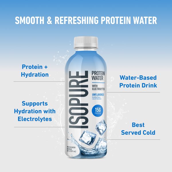 ISOPURE Clear Protein Water flows with your active lifestyle – giving you the protein you want with lightly flavored, refreshing taste anytime that supports hydration with electrolytes. Each convenient, ready-to-drink bottle delivers 15g of ultra-filtered clear whey protein isolate, 0g sugar, 60 calories, no artificial flavors, colors, or sweeteners, and no chalky aftertaste. Enjoy chilled for maximum refreshment during your busy day or during your favorite activities.